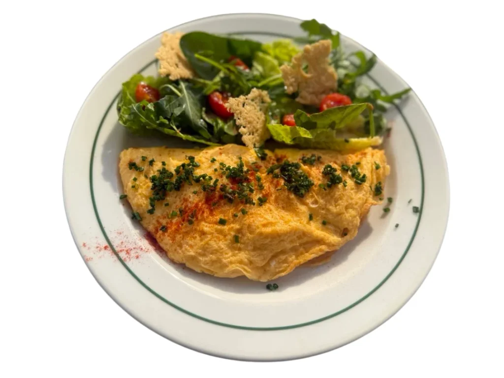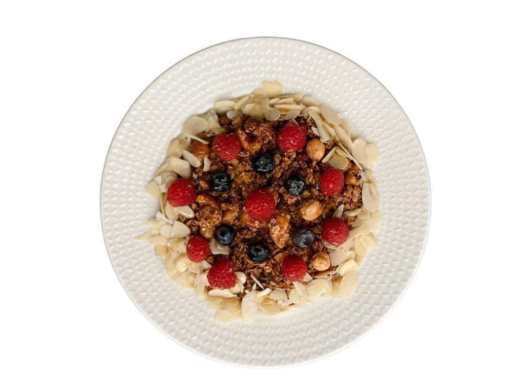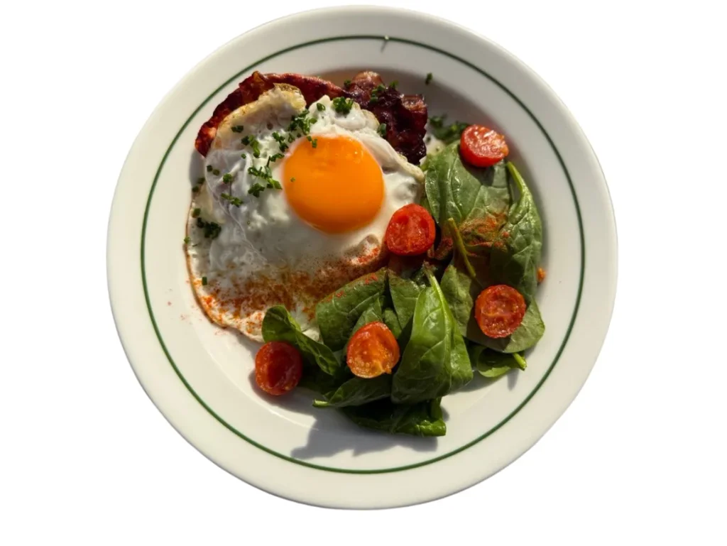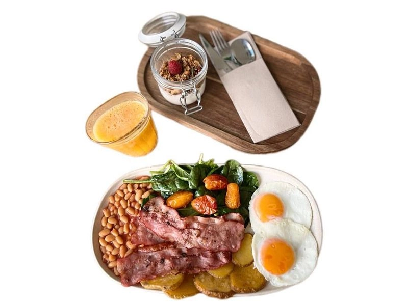 Fatias de bacon crocante, ovos estrelados, batatas assadas, tomates cherry assados (vermelhos e amarelos), salada de espinafres, feijão e batata assada com um toque de alho e temperos. Servido com mini granola e uma bebida à sua escolha.