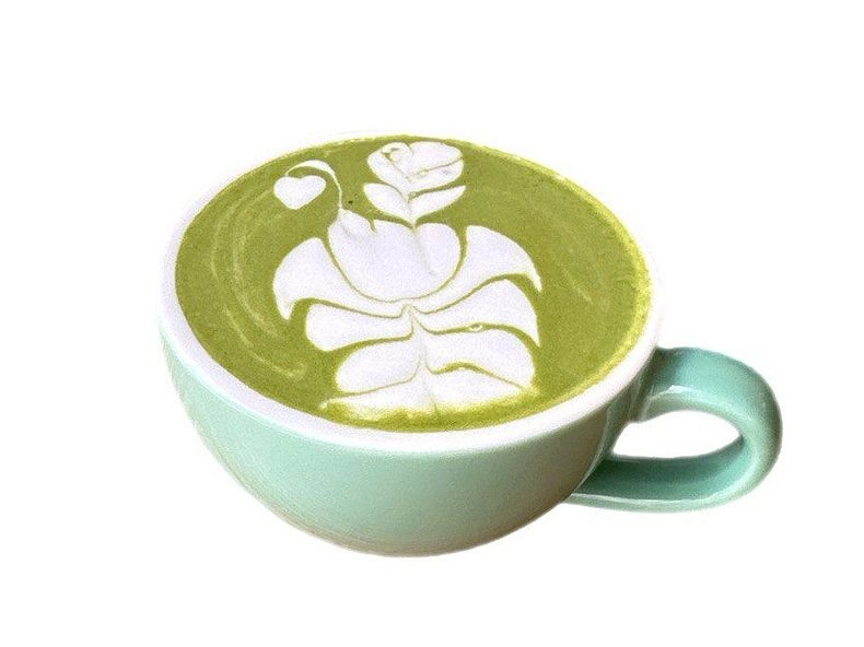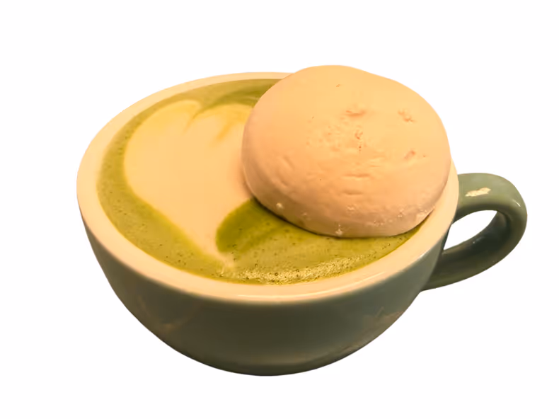 Matcha latte com um delicado aroma de baunilha, servido com merengue de baunilha.