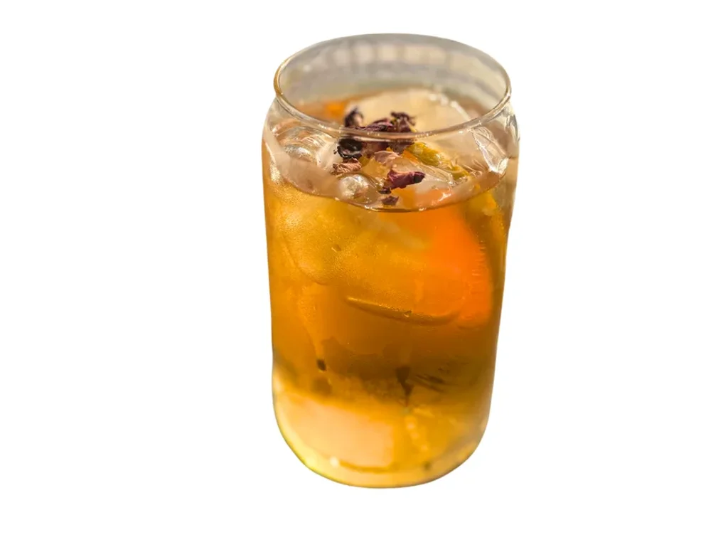 Chá preto frio com rodela de laranja e xarope natural de baunilha.