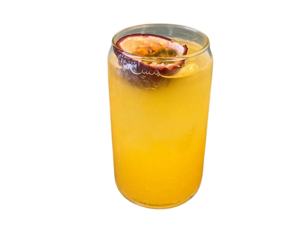 Chá verde frio com xarope natural de manga e maracujá, finalizado com uma rodela de maracujá.